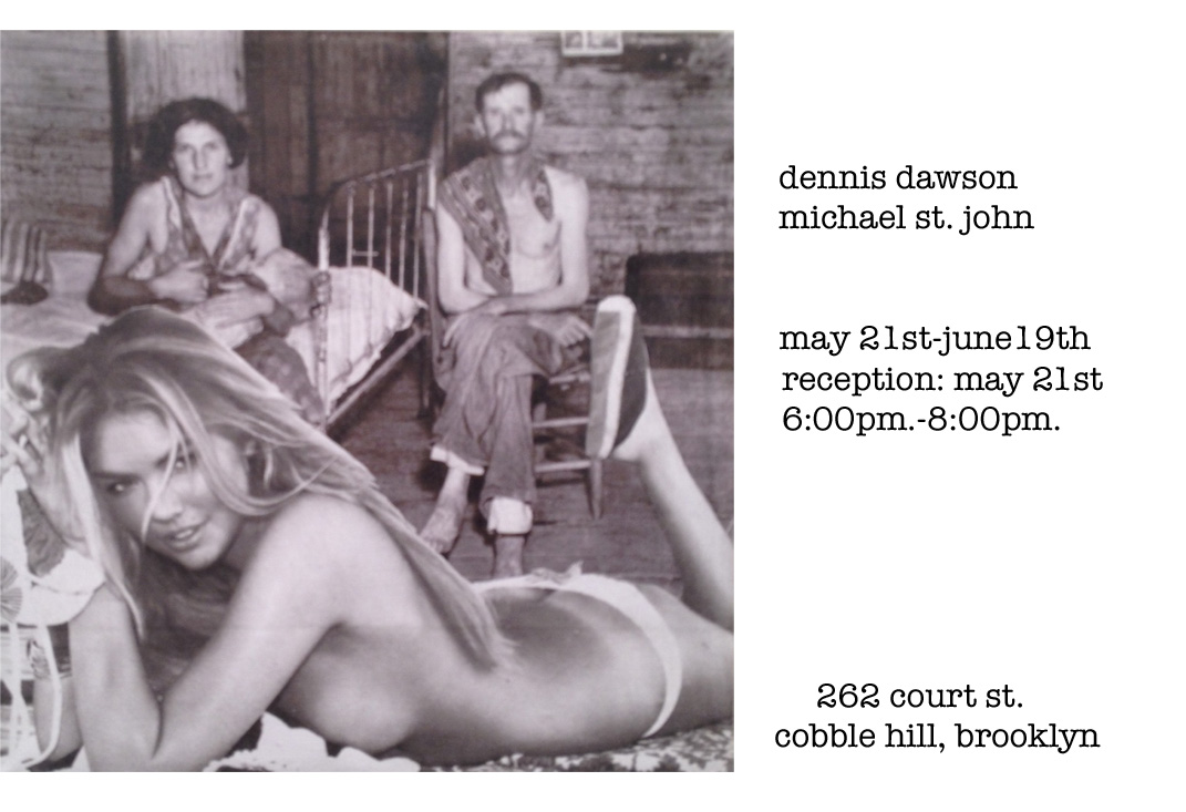 Kathleen Cullen is pleased to present a two-person exhibition featuring paintings by Michael St. John and Dennis Dawson hosted by VESPAProperties in Cobble Hill, Brooklyn. St. John's and Dawson's work is linked by the materiality and object-ness of their paintings' surfaces. Both artists combine painting, collage, and found objects in an attempt to bridge the gap between what one does and sees while out walking around in the world with what goes on inside the studio. Both have an unending obsession with the possibility of disparate materials, and how when used, these materials become important factors in the construction and understanding of content. In this way, materiality and content become one as a means to engender the possibility of meaning. St John's paintings contain actual objects and surfaces, in addition to those represented in trompe l'oeil. His work is actively engaged in conflating modes of representation and is not dissimilar to how we experience the word in a digital culture. The real and the represented merge as one and yet call into question the validity of the other. Dawson's paintings act as a foil to St. John's and further the dialogue between what we experience firsthand and what we receive through mediation. The surfaces of Dawson's paintings recall those of weathered walls and degraded surfaces. His paintings act as locators to an impoverished, gritty and rural world. His intention is to replicate the surfaces and traces with which he has personally encountered . Even when his work comes visually close to their sources, they are condensed constructions that function both as “real” and as representations of the real.