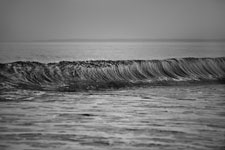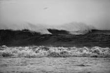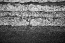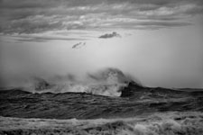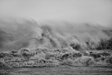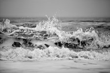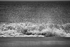 In Sandra Gottlieb’s Black and White series, she zeroes in on the micro-creativity of waves crashing on the same stretch of Atlantic seaboard shore, cast in high relief by the setting sun. Gottlieb’s pictures are conceptual in nature, capturing moments that are structured to make the observer feel small, accept that one moment is quickly overtaken by another, or that some momentary phenomena remain beyond our reach, in terms of human perception. This is why wise beachgoers come away from a day there weary but strangely calm, drained and yet somehow massaged to serene wistfulness by what to others seems like the irritating monotony of the ocean.
