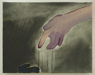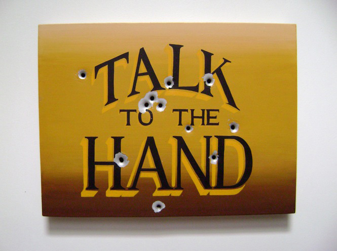 My work is an investigation of language that appropriates symbols and uses words to create new forms. I invite the viewer to ponder the dissemination of the written word and to create their own meanings from these newly rendered configurations. The bullet hole series was my first experience using a gun. Each painting in the on-going series uses a common phrase that contains the word "hand."