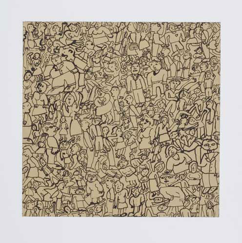 "In most of Halton’s work there is an undercurrent of both violence and humor. Her characters crowd one another or become lost in a labyrinth of detail, but they also often seem strangely happy in their entangled fates: they smile, wave at the viewer, talk to each other, or try to step out of the picture plane altogether. There is a central paradox at work here that gets to certain home truths: we need each other, we need the often untidy morass of day-to-day life, but the familiar comforts that cushion our lives can also be sources of anxiety and confusion.” -Ann Landi