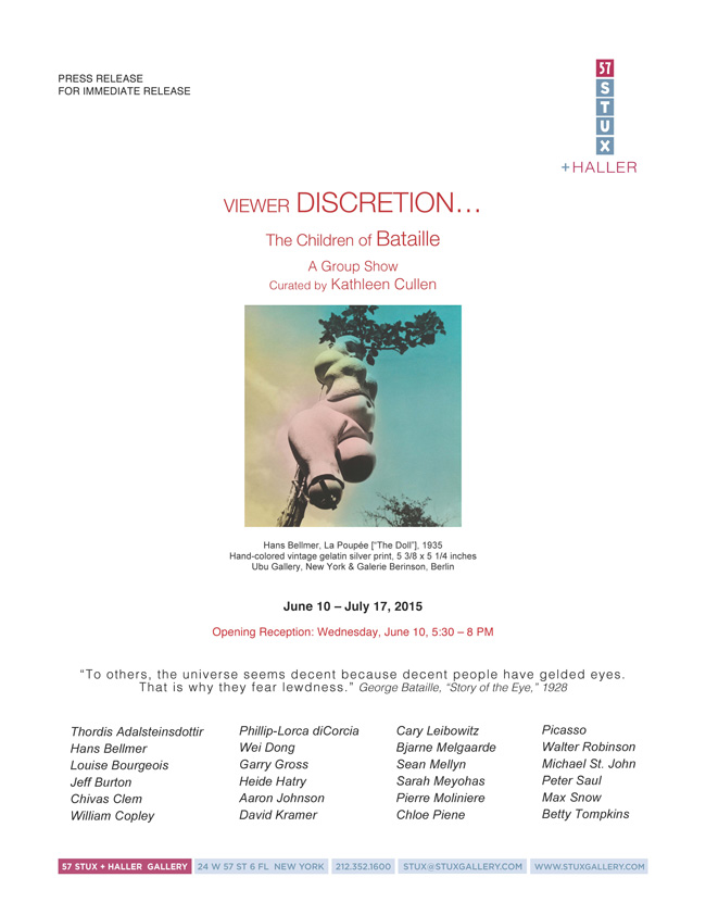 Scott Indrisek at ARTinfo says, "ALSO WORTH SEEING: Speaking of sinister, my Louise Blouin Media colleague Kathleen Cullen has curated a Georges Bataille-themed group show up at STUX + HALLER, on view through July 17. It includes button-pushing work by Hans Bellmer, Aaron Johnson, Bjarne Melgaard, Peter Saul, Betty Tompkins, and others."